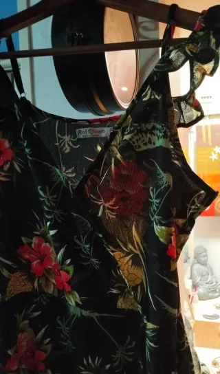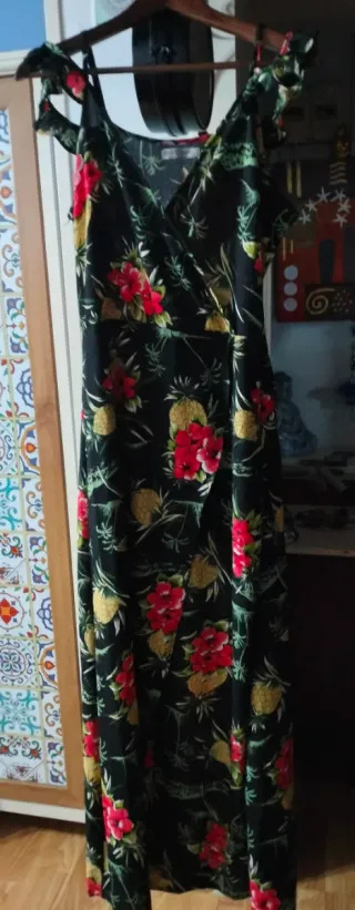 Precioso vestido largo con estampado floral en fondo negro. Cremallera lateral.(5foto) Tirantes tipo sujetador (ajustable)y volante que cae sobre el hombro. Queda muy bonito favorecedor y muy cómodo de llevar. Sisa:50cm. Largo desde debajo del pecho,(la linea que se ve en la foto) para abajo,1'07cm. A estrenar