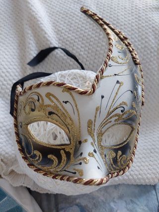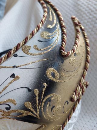 Elegante máscara veneciana, perfecta para fiestas de disfraces o eventos especiales. Su diseño detallado y acabados dorados le dan un toque sofisticado. Comprada en Venecia. Perfecto estado, como nueva. - Adornada con detalles dorados y plateados. - Borde trenzado en tonos marrón y dorado. - Incluye cinta negra para sujetar.