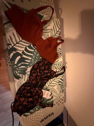 Conjunto de dos sujetadores con un diseño floral y otro liso. - Sujetador con estampado floral. - Sujetador liso en color terracota.