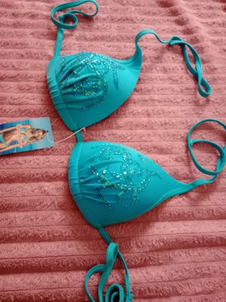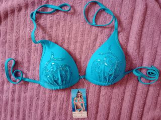 Sujetador azul bikini con forma triangular y lentejuelas en el pecho