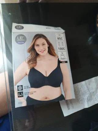 Se venden dos sujetadores con aro de la marca UP2 FASHION en color negro. Hubo un error en la talla, y no se puede cambiar. - Talla 100C. - Tejido suave y cómodo. - Tirantes sin cortes.