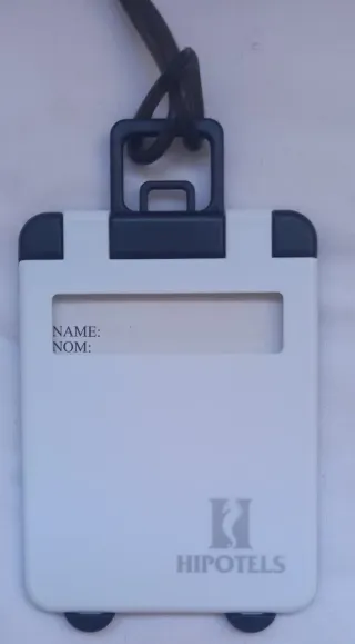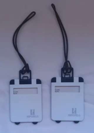Lote de dos etiquetas para equipaje de la marca Hipotels. Son perfectas para identificar tus maletas. - Diseño en forma de maleta. - Espacio para escribir nombre y datos de contacto. - Incluyen cordón para sujetar.
