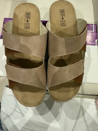 Comfort Class El modelo 164 de la firma española Comfort Class es una sandalia hecha en piel y con dos velcros de ajuste. El pie queda muy bien sujeto para caminar, además es una sandalia que acepta pies anchos al poder regularse con los velcros. Tiene plantilla extraíble, esto quiere decir que se puede quitar y poner otra en su lugar, al quitarla se queda un borde para que la plantilla no se mueva. El piso es de eva, es confortable en cuanto a pisada y no pesa nada. Es un piso grueso y por detrás la cuña tiene unos 3,5 cm de alto aproximadamente TALLA 42 SIN USO, A estrenar