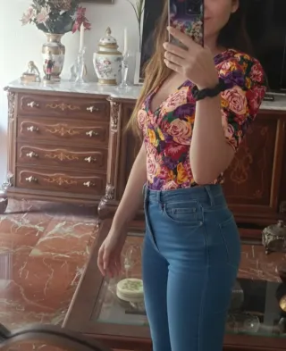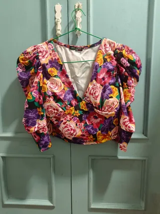 Top de mujer con estampado floral vibrante. - Diseño con escote en V. - Mangas cortas abullonadas. - Tejido ligero y cómodo. - Cascos incorporados para no llevar sujetador