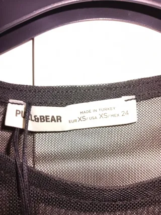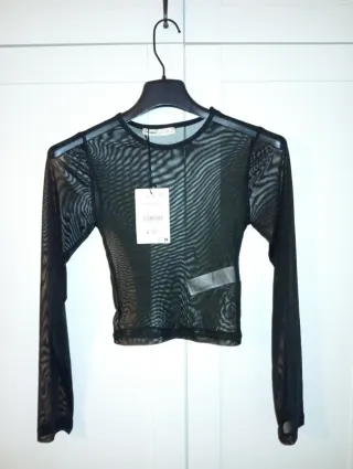 Camiseta de manga larga con tejido elástico de tul transparente. - Diseño ajustado, talla XS. - Cuello redondo. - Queda ideal bajo tops y chalecos sin mangas, y muy sensual dejando ver un bonito sujetador o bralette debajo. Otra idea original para el invierno es lucirlo bajo tops lenceros satinados de tirantes, siguiendo la actual tendencia del "layering" consistente en la superposición de prendas ( como se puede apreciar en la última foto).