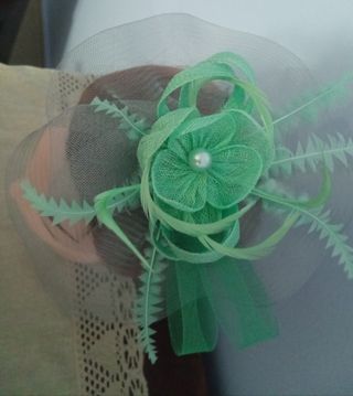 Tocado en tono verde agua y gris claro. puede sujetarse con diadema.