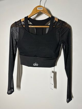 Top deportivo Alo Yoga de manga larga con detalle de malla. - Diseño de doble capa. - Tejido de malla transparente en las mangas. - Banda elástica en la cintura.