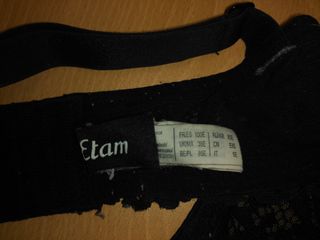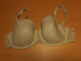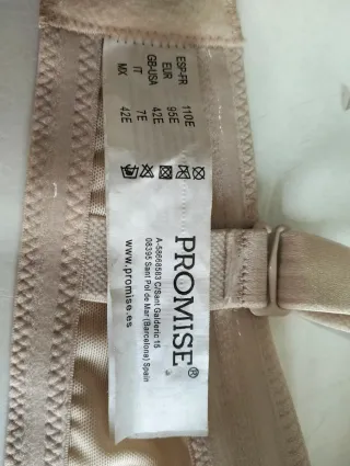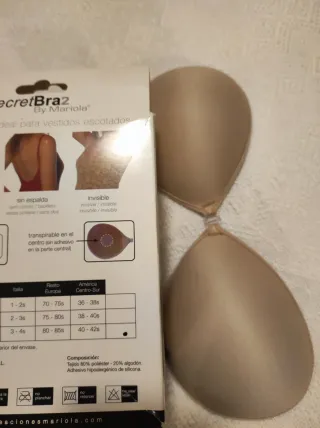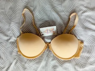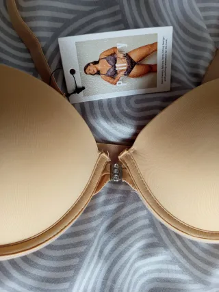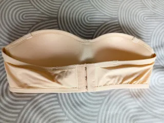 Sujetador con tirantes removibles en color beige, con etiqueta. Se puede abrochar tanto en la parte de delante como atrás. Con cierto relleno para un efecto push-up. Aunque pone 75 B, según la web equivale a una 90B en talla europa