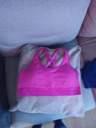 Conjunto de dos sujetadores deportivos y una camiseta. Todo es talla 38 o S aproximadamente Entrega en Sanchinarro - Sujetador deportivo azul. - Sujetador deportivo rosa. - Camiseta blanca.