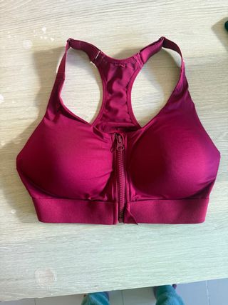 Sujetador deportivo de color granate con cierre de cremallera frontal. - Diseño de tirantes cruzados en la espalda. - Banda inferior elástica para un mejor ajuste. - Cremallera frontal para facilitar su puesta y retirada. - Solo se ha usado una vez, precio de tienda: 29,99