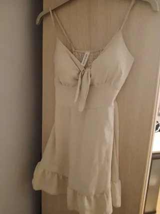 Precioso vestido de verano con volantes. Además se regala sujetador talla 90 lunares negro. - color beige - Diseño con tirantes finos, son ajustables. - cintura entallada - Detalle de nudo en la parte delantera. - Cuerpo fruncido. - Bajo con volantes.