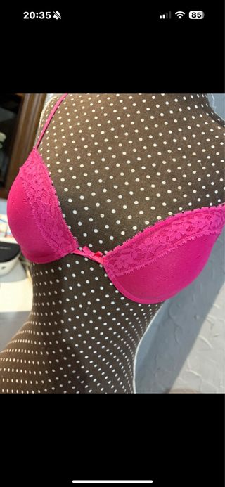 Sujetador de color fuscia con detalles de encaje. - Copas con relleno. - Tirantes ajustables. - Adorno de lazo en el centro. - Usado una vez.