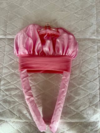 Set para rizar el cabello sin calor, en un bonito tono rosa. - Rizador de tela satinada. - Gorro de satén para proteger el cabello. - Pinza para sujetar el rizador.