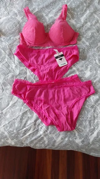 Conjunto de lencería de la marca Tezenis. Fucsia, sujetador super pushup up con encaje superpuesto muy bonito. El sujetador es la 90B francesa y española. Las 3 braguitas a juego son talla M, con ribete en todos los acabados. Todo a estrenar Si te interesa algo más de mi perfil se hace descuento automático y ahorras en los gastos de envío. - Sujetador estilo super push-up. - Braguita a juego.