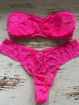 Preciosa y delicada lencería de la marca MarieMeili. El conjunto incluye un sujetador bandeau y una braguita de encaje. - Nuevo sin etiqueta - Diseño de encaje floral. - Color rosa intenso. - Talla S (EU) / 10 (UK) - Tirantes opcionales