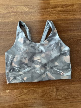 Lote de 3 tops deportivos Dash & Stars en talla M, cómodos y con sujeción media. Dos con estampado tipo camuflaje artístico y uno en color coral liso, todos con tejido elástico, transpirable y de secado rápido. Los 3 tienen relleno extraíble y los modelos estampados disponen de cierre trasero ajustable. En perfecto estado, apenas usados ✨