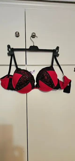 Sujetador con un diseño llamativo en rojo y negro, con detalles de encaje. - Copas con relleno. - Tirantes ajustables. - Cierre de corchetes en la espalda.