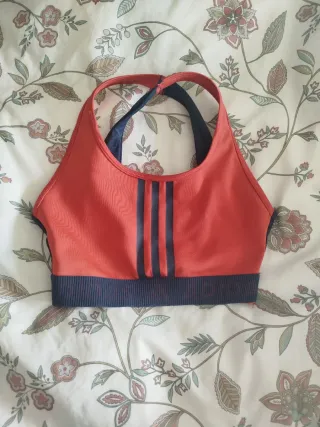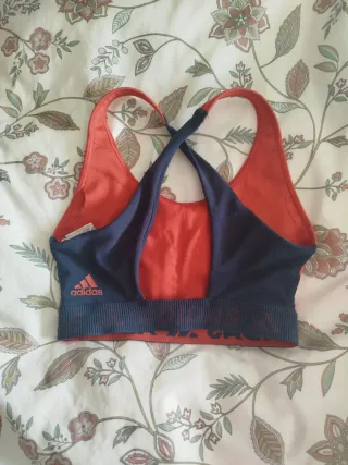 Top deportivo Adidas para mujer, con un diseño moderno y cómodo. - Color principal rojo con detalles en azul. - Tiras cruzadas en la espalda. - talla xs