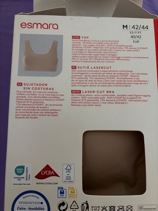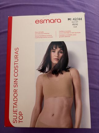 Sujetador tipo top de la marca Esmara, diseñado para ofrecer máxima comodidad. - Sin costuras para evitar molestias. - Diseño invisible que no se nota bajo la ropa ajustada. - Tejido suave y confortable.