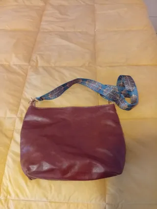 Bolso de hombro con un diseño moderno y una correa llamativa. - Material: Polipiel. - Correa: Estampado étnico en tonos azules y dorados. - Cierre: Cremallera. - Interior: Compartimento principal espacioso.
