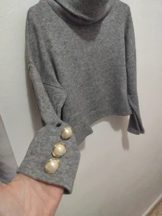 Jersey de mujer con cuello alto y un diseño frontal adornado con pequeñas pedrerías. - Cuello alto. - Detalle de pedrería en la parte delantera. - Diseño con aberturas en el escote.