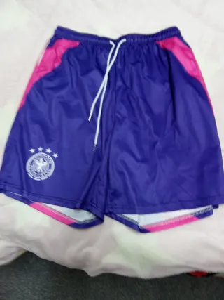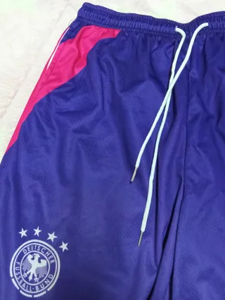 Calzonas deportivas de Alemania, talla XXL. Perfectas para entrenamientos gracias a su tejido de secado rápido. - Diseño con detalles en rosa y morado. - Cintura elástica con cordón ajustable. - Escudo de Alemania con estrellas en el lateral.