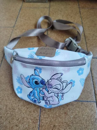 Riñonera con estampado de Stitch y Ángel de Disney. Ideal para llevar tus esenciales. - Diseño con personajes de Disney. - Estampado floral y de hojas en tonos azules y rosas. - Etiqueta de cuero sintético con el nombre Stitch & Angel.