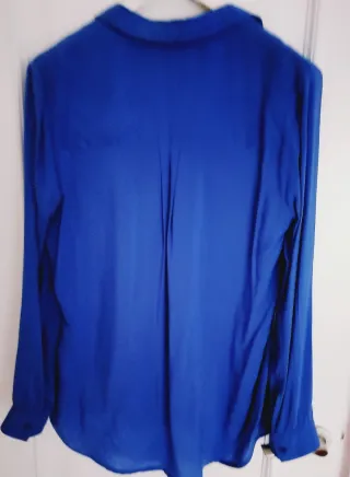Elegante blusa de manga larga. - Color azul vibrante. - Dos bolsillos frontales con solapa. - Cuello camisero. - Cierre de botones.