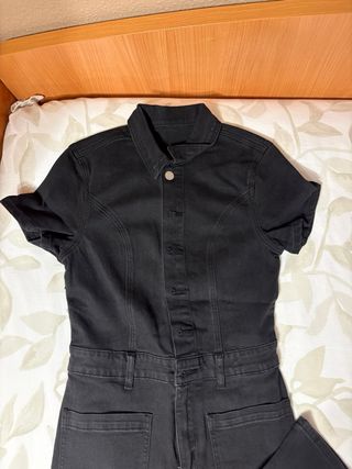 Mono vaquero de color negro. Presenta un diseño con cuello camisero y cierre de botones. - Manga corta. - Bolsillos delanteros. - Piernas acampanadas. Es elástico y se adapta muy bien a la figura