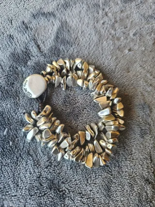 Pulsera triple de la marca UNOde50, con un diseño único que combina cuero y piezas plateadas. - Cierre de cuero. - Piezas metálicas con acabado plateado. - Diseño de tres vueltas.