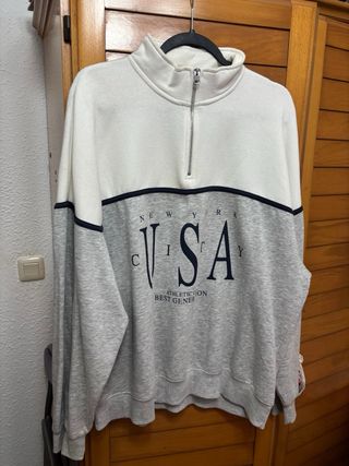 Sudadera de Bershka con diseño bicolor y detalles gráficos. Aunque es M, es oversize - Parte superior blanca y parte inferior gris. - Cuello alto con media cremallera. - Estampado NEW YORK USA CITY en contraste.