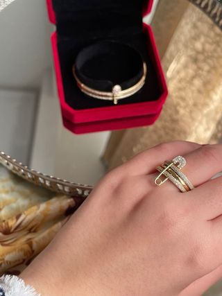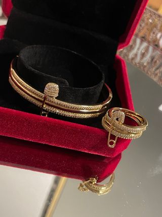 Precioso conjunto de joyería que incluye un brazalete y un anillo. - Diseño elegante con detalles de circonitas. - Acabado en tono dorado. - Completamente nuevos. - Incluyen la caja. - Anillo talla 7. - Identico al color del oro.