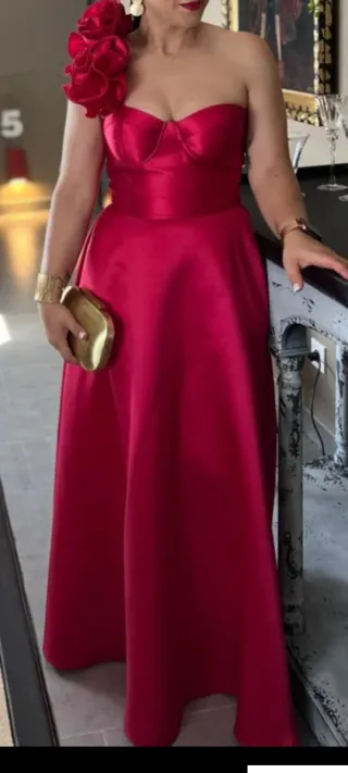 Elegante vestido de fiesta largo, con un diseño strapless y un detalle de flor en el hombro. - Color rojo vibrante. - Diseño strapless. - Adorno de flor en el hombro. - Solo puesto un rato.