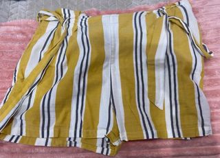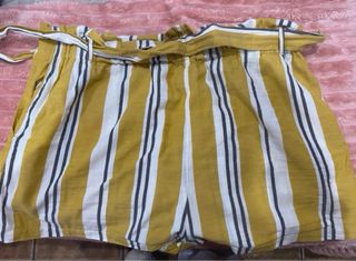 Shorts de rayas verticales en tonos amarillos, blancos y negros. Tienen un cinturón para anudar. - Diseño a rayas. - Cinturón de tela.