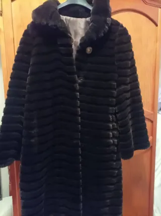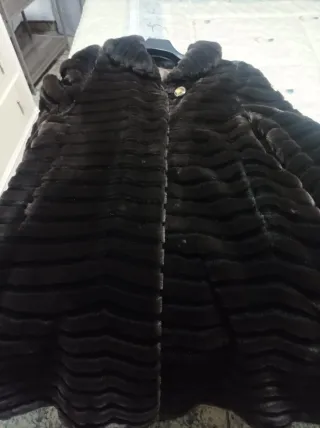 Abrigo negro con forro interior de borreguito y capucha. - Cierre de cremallera y botones. - Bolsillos frontales con solapa. - Puños ajustados. - Cordón ajustable en el bajo.