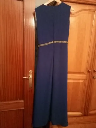 Elegante vestido largo de color azul, ideal para eventos especiales. - Diseño sin mangas. - Detalle de pedrería en la cintura. - Escote drapeado.