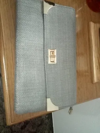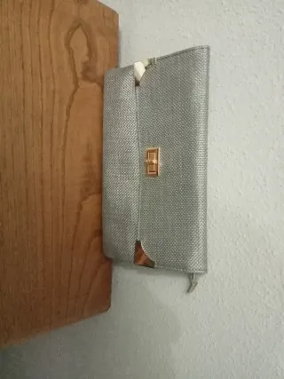 Elegante cartera de mano en tono gris plata, perfecta para complementar tu atuendo. - Acabado texturizado. - Cierre metálico dorado. - Esquinas reforzadas con detalles dorados.