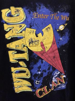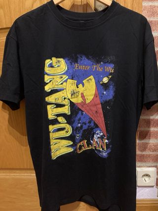 Camiseta con diseño espacial del Wu-Tang Clan. - Estampado frontal con el logo y temática cósmica. - Enter The Wu y Clan integrados en el diseño. - Fondo azul con estrellas y planetas.