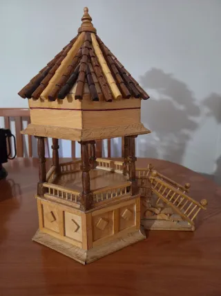 Este joyero está hecho de madera y tiene un diseño de casa o templo. - Tapa con bisagras y un pequeño pestillo dorado. - Techo a dos aguas con detalles de madera. - Escaleras de acceso. - Columnas decorativas.