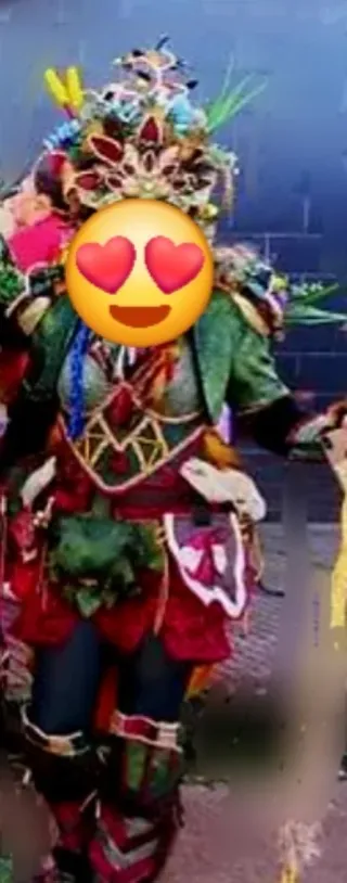 Disfraz de comparsa con detalles en verde y rojo. Ideal para fiestas o eventos. - Diseño elaborado y llamativo. - Incluye varios elementos decorativos. Premiado, posibilidad de varias tallas
