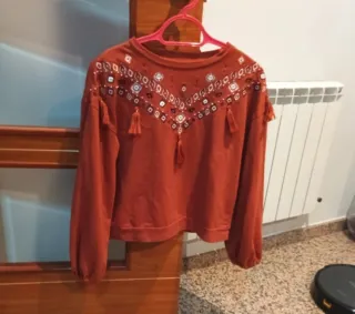 Camiseta de manga larga para mujer con un diseño étnico en la parte delantera. Talla S/M - Cuello redondo. - Mangas largas abullonadas. - Detalle de bordados y flecos en el pecho. - Color base color marrón