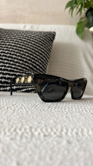 Gafas de sol Versace. Originales de los años 90. Color negro y caqui con logo dorado. Pregunta si necesitas más información. Son ideales😍. Las vendo porque soy hija de óptico y tengo muchas gafas.
