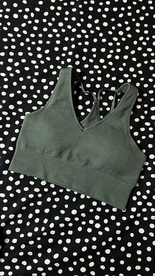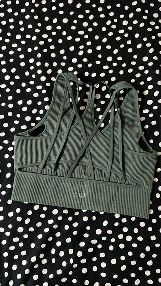 Top deporte, color verde, con almohadillas extraibles, sujeta bastante, muy cómodo. Talla s/m.