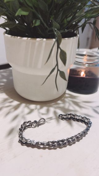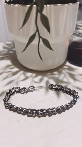 Pulsera de plata imitando forma de cadena de bici, súper original.