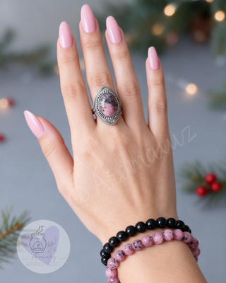 Conjunto de joyería artesanal con piedras semipreciosas. - Anillo con piedra central de rodocrosita. - Pulsera de cuentas de rodocrosita. - Diseño elegante y único.