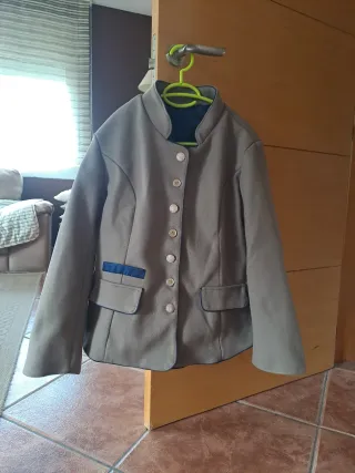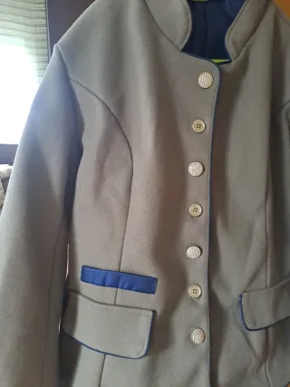 Elegante blazer de mujer en color beige con detalles en dorado. - Diseño con cuello mao. - Cierre de botones. - Dos bolsillos frontales con solapa. - Detalle de cinta azul en los bolsillos.