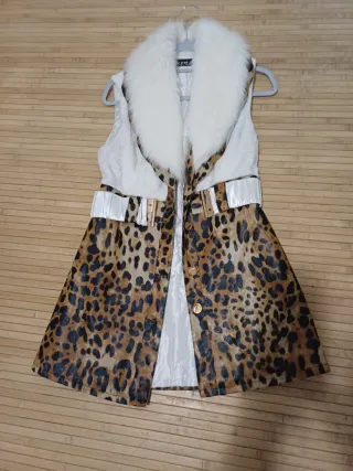 Chaleco largo con un llamativo estampado de leopardo y un suave cuello de pelo sintético blanco. El diseño incluye cinturones decorativos con hebillas doradas en la cintura y botones frontales. - Estampado de leopardo. - Cuello de pelo sintético blanco. - Cinturones con hebillas doradas. - Botones frontales.