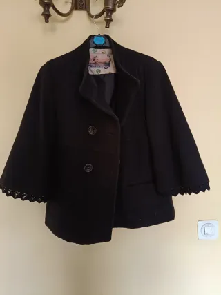 Abrigo de invierno con forro interior de borreguito. - Material exterior de poliéster. - Diseño con solapas y cierre de botones. - Puños y cuello con acabado de borreguito. - Tiene dos marcas o taras pequeñas como se ve en la foto, de ahí el precio que le he puesto.