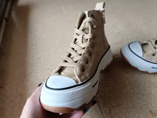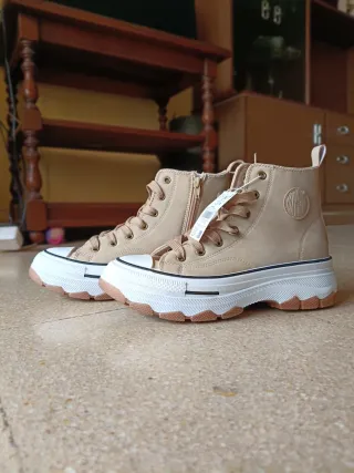 Zapatillas altas de la marca Merkal en color beige y suela blanca. Me costaron 59€ - Cierre con cordones y cremallera lateral. - Detalle de logo circular en el lateral. - Suela gruesa con diseño dentado.
