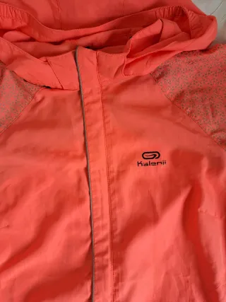 Chaqueta cortavientos de la marca Kalenji en color naranja. Ideal para actividades al aire libre. - Diseño con capucha. - Tejido ligero y transpirable. - Detalles reflectantes en las mangas.